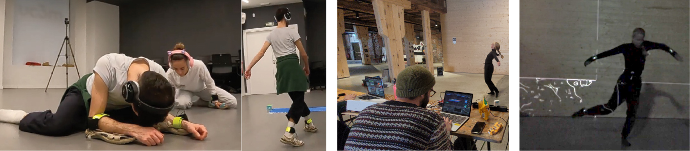 From Movement to Sound and Back: movement sonification in artistic expression during workshop (left) and performance (right) Middle: using the Movement-Sonification toolkit as basis for the performance.